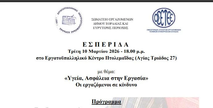 Εσπερίδα με θέμα «Υγεία, Ασφάλεια στην Εργασία» θα πραγματοποιηθεί Τρίτη 10 Μαρτίου 2026, στις 18.00, στο Εργατοϋπαλληλικό Κέντρο Πτολεμαΐδας. Στην εκδήλωση θα μιλήσουν: -Ο διδάκτορας Ανδρέας Στοϊμενίδης, (Πρόεδρος Ομοσπονδία Συλλόγων Εργαζομένων Τεχνικών Επιχειρήσεων Ελλάδος – ΟΣΕΤΕΕ, Γραμματέας Υγιεινής και Ασφάλεια της Εργασίας – ΥΑΕ της ΓΣΕΕ, Πρόεδρος Ευρωπαϊκού Οργανισμού για την Υγιεινή και Ασφάλεια της ... Περισσότερα